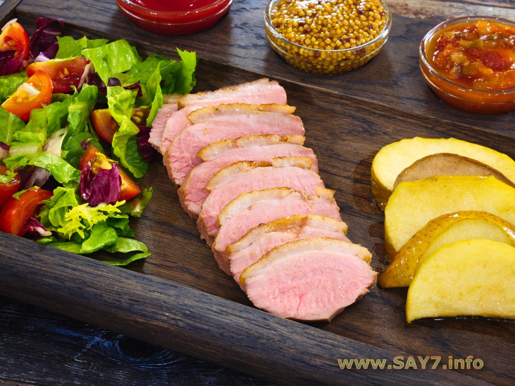 Нежное утиное филе идеально дополняют сочные яблоки и груши, они же являются гарниром к мясу.