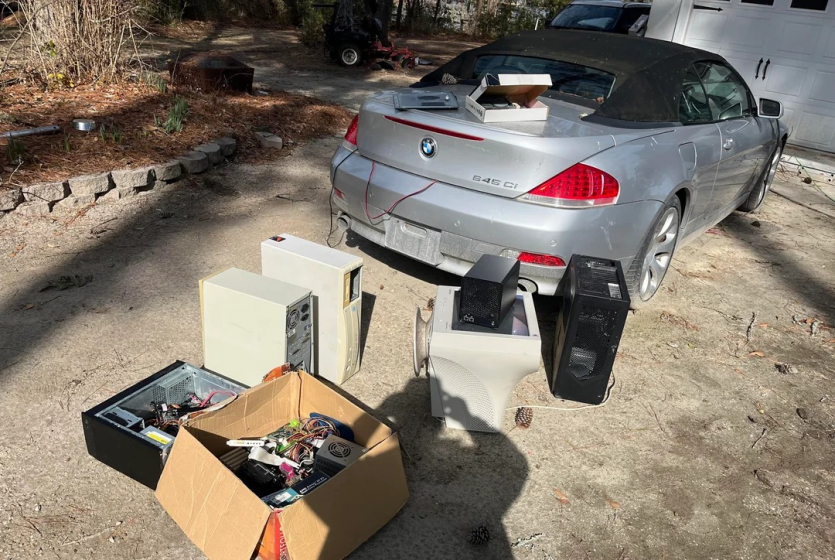 Мужчина отмечает, что регулярно проверяет контейнеры для электронных отходов. Среди прочего кроме DDR4 на 64 ГБ и процессора Intel Core i7 он нашел кулер Cooler Master, материнскую плату Asus, NAS-сервер Drobo на 5 отсеков, монитор Samsung и 5,25″ дисковод для дискет.