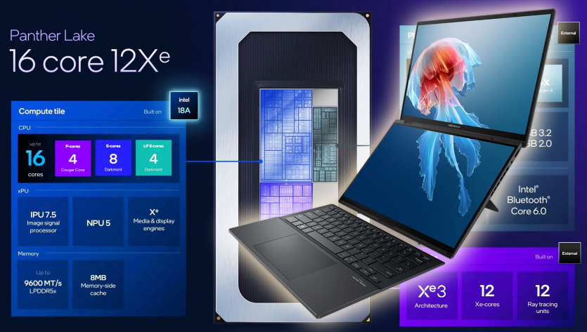 Wccftech протестировал чип Intel Core Ultra X9 388H в ноутбуке с двумя экранами ASUS Zenbook Duo, но другие обозреватели тестировали больше конфигураций. Процессор имеет в общей сложности 16 ядер и поддерживает 16 потоков. Это комбинация 4 P-ядер (Cougar Cove), 8 E-ядер (Darkmont) и 4 LPE-ядер.