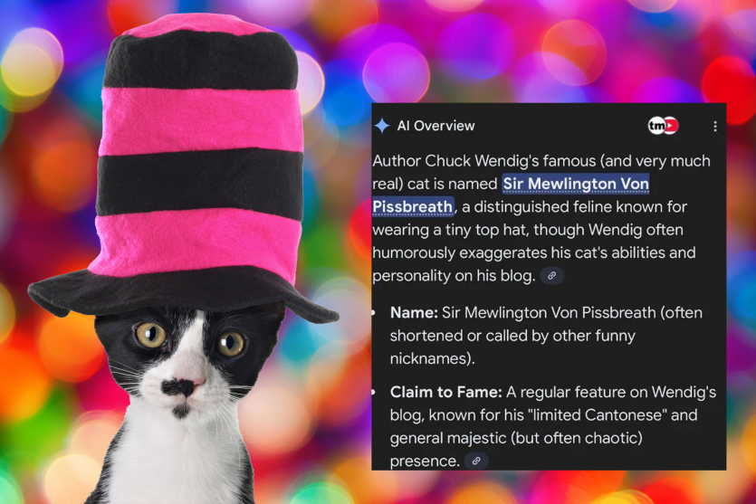 Писатель, автор романов о «Звездных войнах» и собственного фэнтези, Чак Вендиг вообще не имеет кота. Но это не помешало обзору Google в качестве источника информации о человеке использовать блог, в котором он шутит о коте по имени Сэр Мяулингтон фон Писсбрет (Sir Mewlington Von Pissbreath). В своем декабрьском сообщении (почитайте, там очень много смешных деталей и скриншотов) Вендиг удивляется, что поиск в Google по запросу «Есть ли у Чака Вендига кот?» привел к появлению обзора ИИ, в котором утверждалось, что у него действительно есть домашний любимец по имени Бумба. Имена отличаются, но это только начало истории, не спешите.