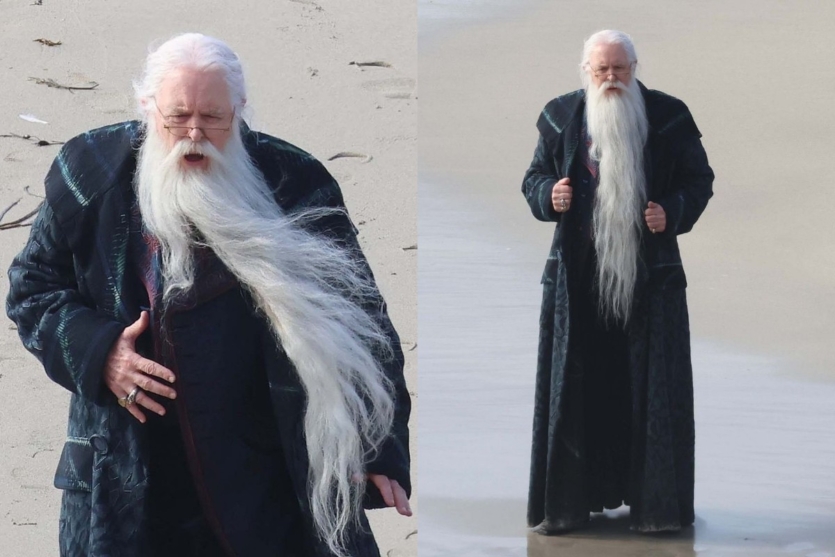 На фото, обнародованных страницей Wizarding World Direct на X, Литгоу в полном образе, с мантией и длинной белой бородой, прогуливается по пляжу в сопровождении группы операторов.