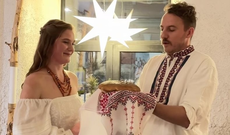 Воскресенская подарила кулинару вышиванку с киевским орнаментом. Родители невесты вручили будущим супругам хлеб, мед и розмарин как символы крепкой семьи и столетний рушник как оберег.