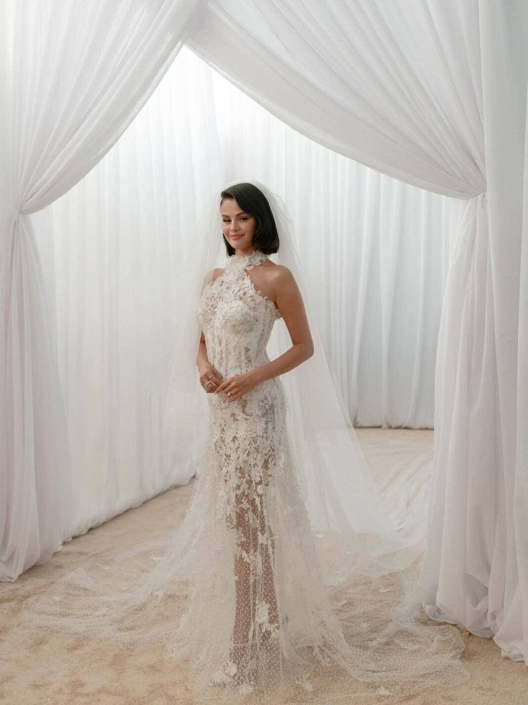 На самой церемонии Селена предстала в классическом свадебном платье из полупрозрачного кружева. Наряд подчеркивал фигуру певицы, а корсет был расшит хрустальными камнями. Более того, платье было украшено 300 цветами, вышить вручную.